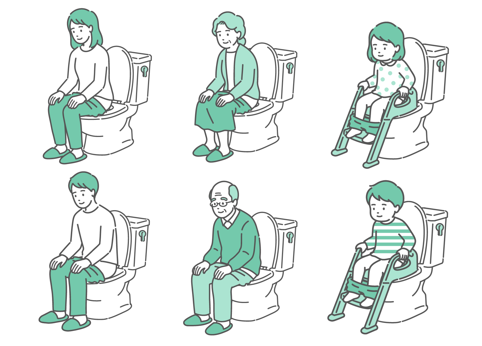 介護・福祉 トイレに座る人々のイラストセット(全世代・男女・子供・快便・リラックス)