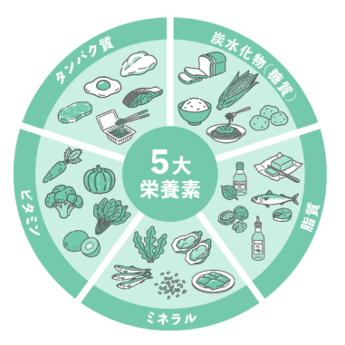 アイテム・アイコン 五大栄養素の食材円グラフ(炭水化物・脂質・タンパク質・ビタミン・ミネラル)