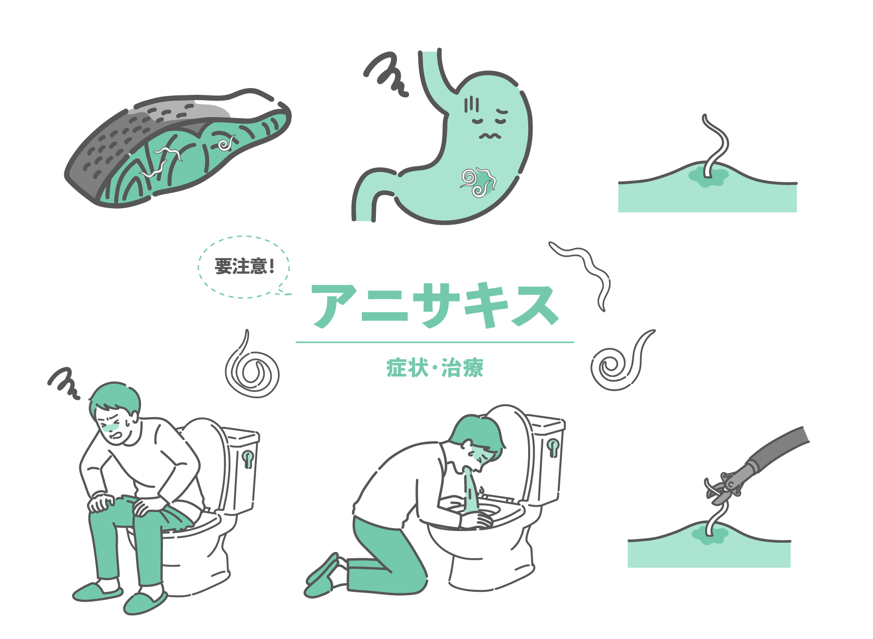 血液・循環器系 アニサキス症の症状・原因・治療(内視鏡摘出)の図解イラスト