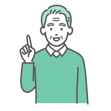 指差し・ポイントを解説する高齢男性のイラスト(ひらめき・上半身)