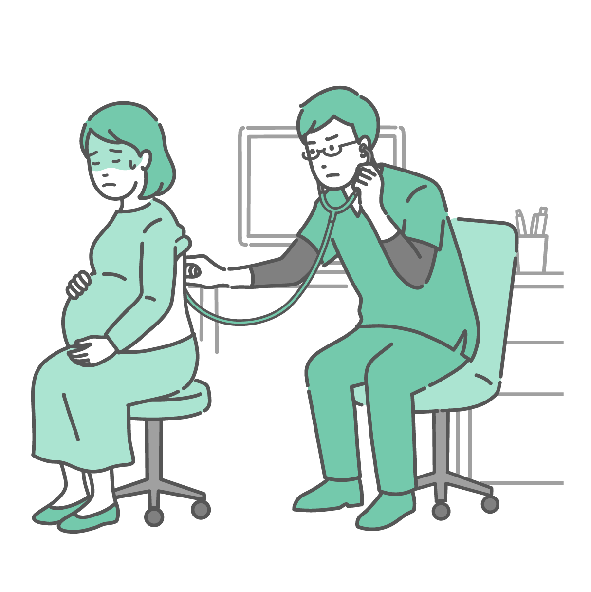 女性の健康・更年期 スクラブを着用した男性医師による妊婦の背中の聴診イラスト