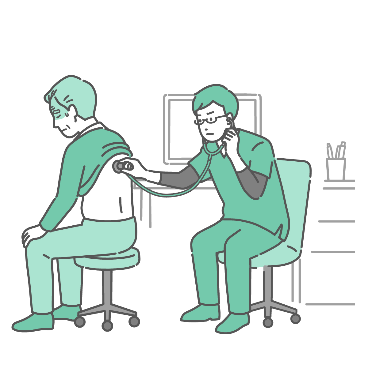 介護・福祉 背中の聴診を受ける冷や汗をかいた高齢男性と深刻な表情のスクラブの男性医師のイラスト