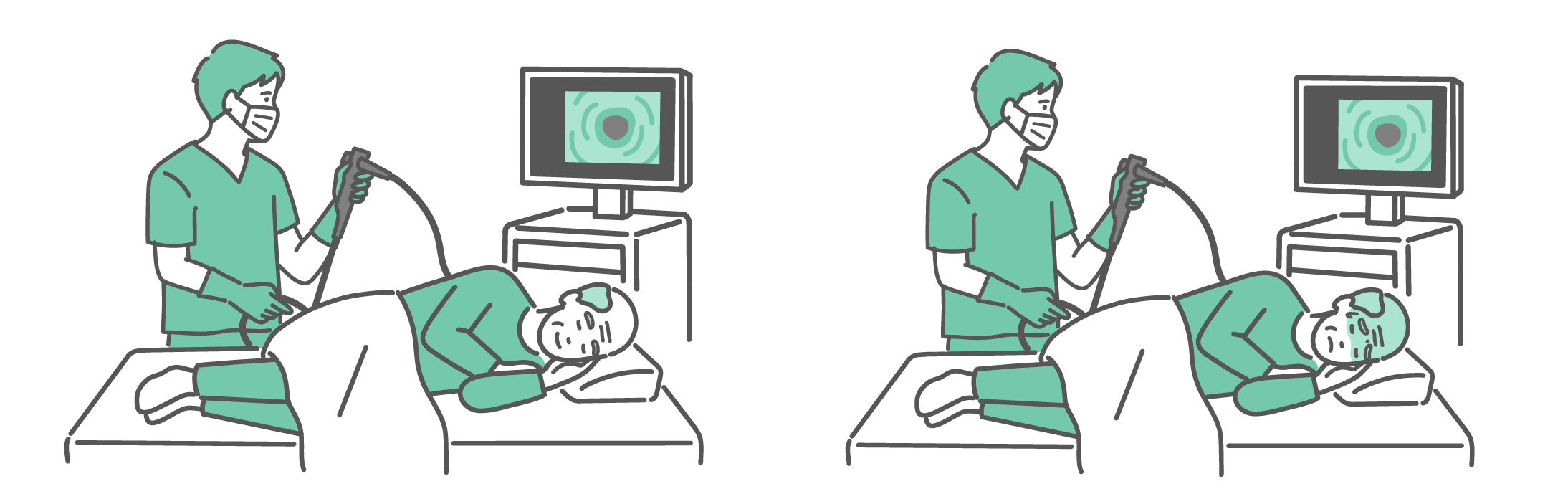 介護・福祉 大腸カメラ検査の比較イラスト(高齢男性・鎮静剤あり・なし/無痛・苦痛)