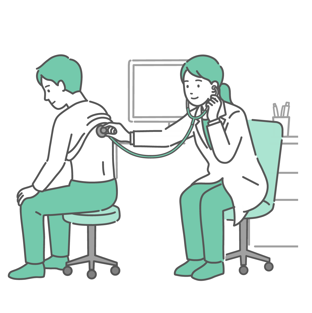 季節・アレルギー症状 白衣を着た女性医師による男性患者の背中の聴診・診察のイラスト