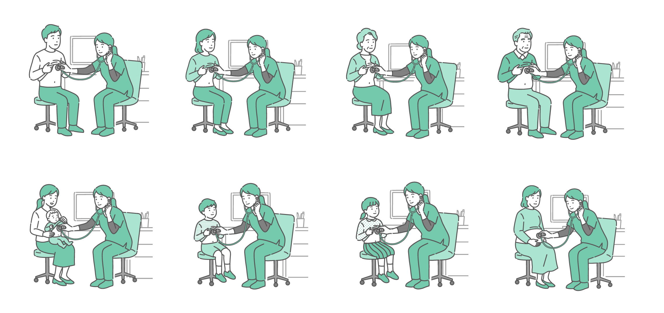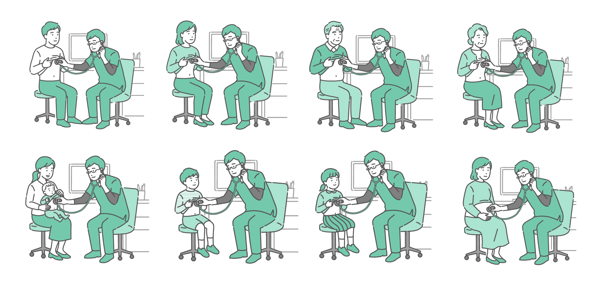 検査・測定 スクラブを着た男性医師の聴診イラスト全種セット(老若男女・妊婦・小児)
