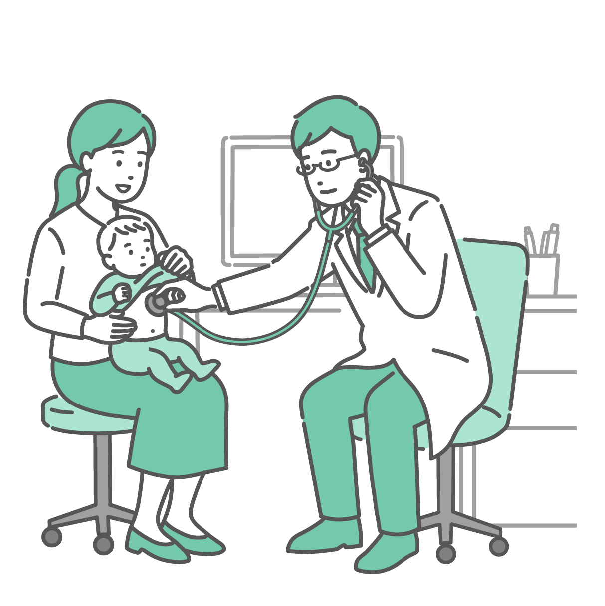 小児科・子供の健康 聴診器で赤ちゃんを診察する男性医師(白衣・小児科・親子)