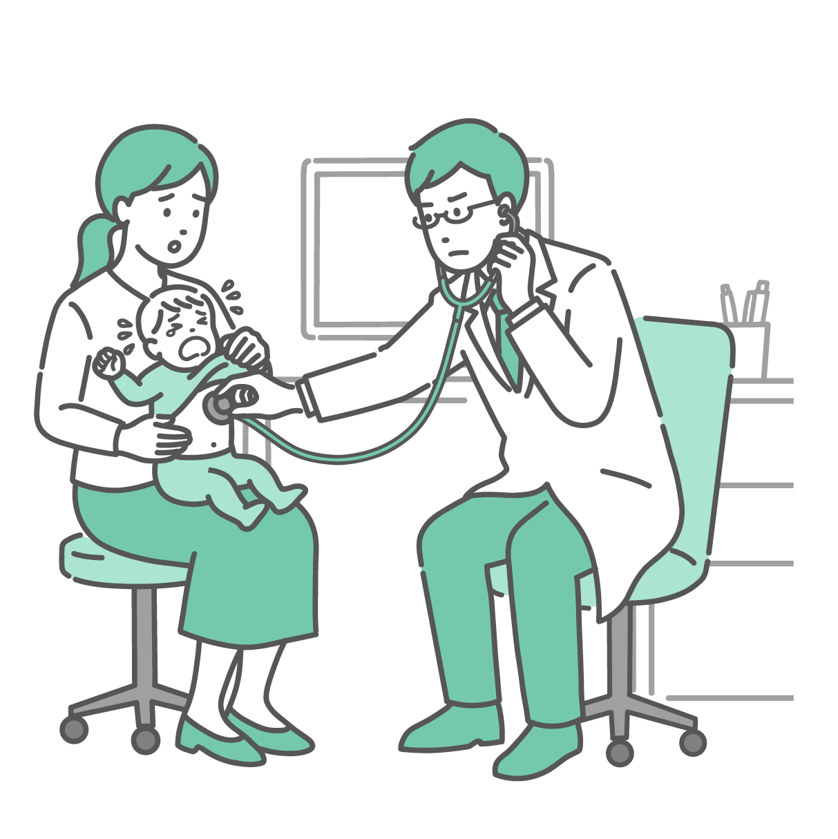小児科・子供の健康 聴診器で泣いている赤ちゃんを診察する男性医師(白衣・小児科・体調不良)
