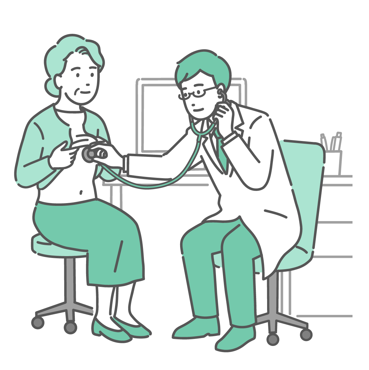介護・福祉 聴診器で胸の音を聞く男性医師(白衣・高齢女性患者)