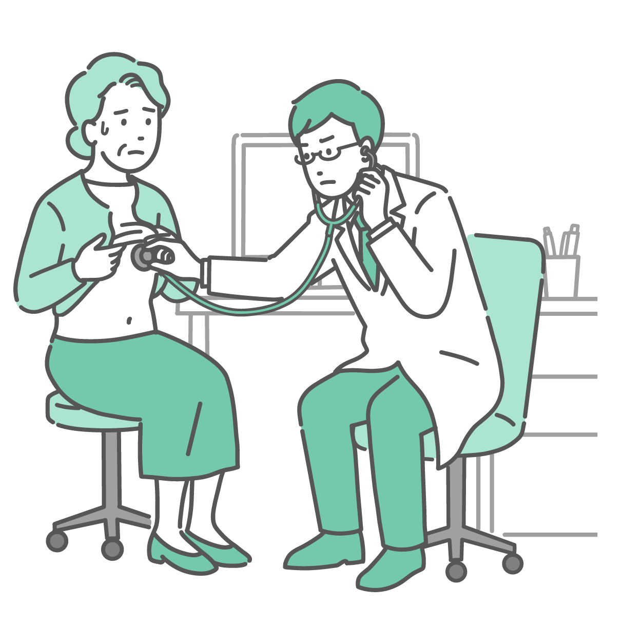 介護・福祉 聴診器で異常を確認する男性医師(白衣・体調不良の高齢女性患者)