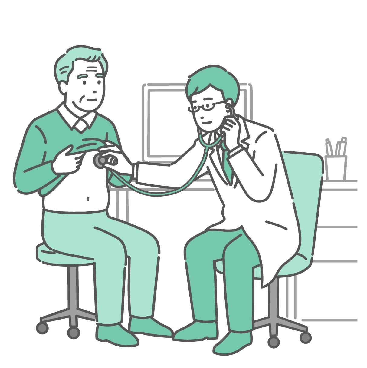 介護・福祉 聴診器で胸の音を聞く男性医師(白衣・高齢男性患者)