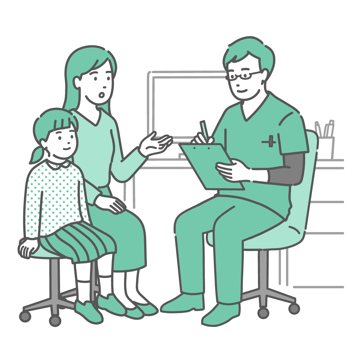 小児科・子供の健康 問診をする男性医師と女の子と母親(スクラブ・小児科・皮膚科)