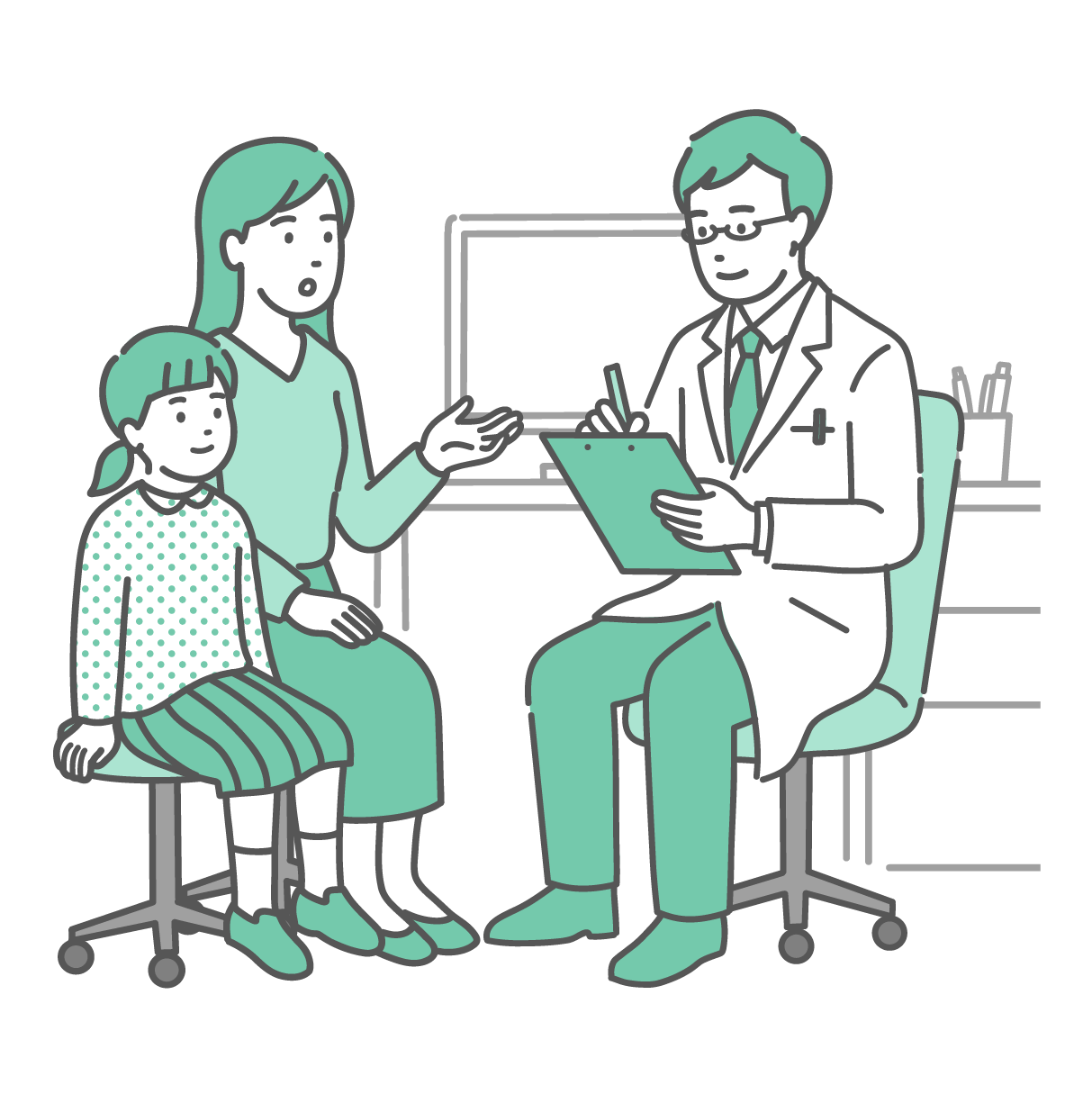 小児科・子供の健康 問診をする男性医師と親子(女の子・白衣・小児科)