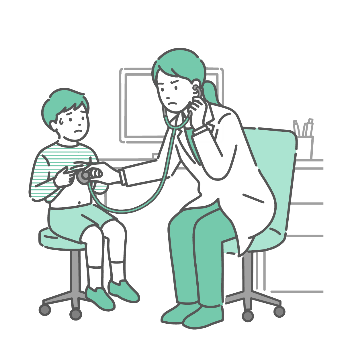 小児科・子供の健康 聴診を受ける冷や汗をかいた男の子と深刻な表情の白衣の女性医師のイラスト