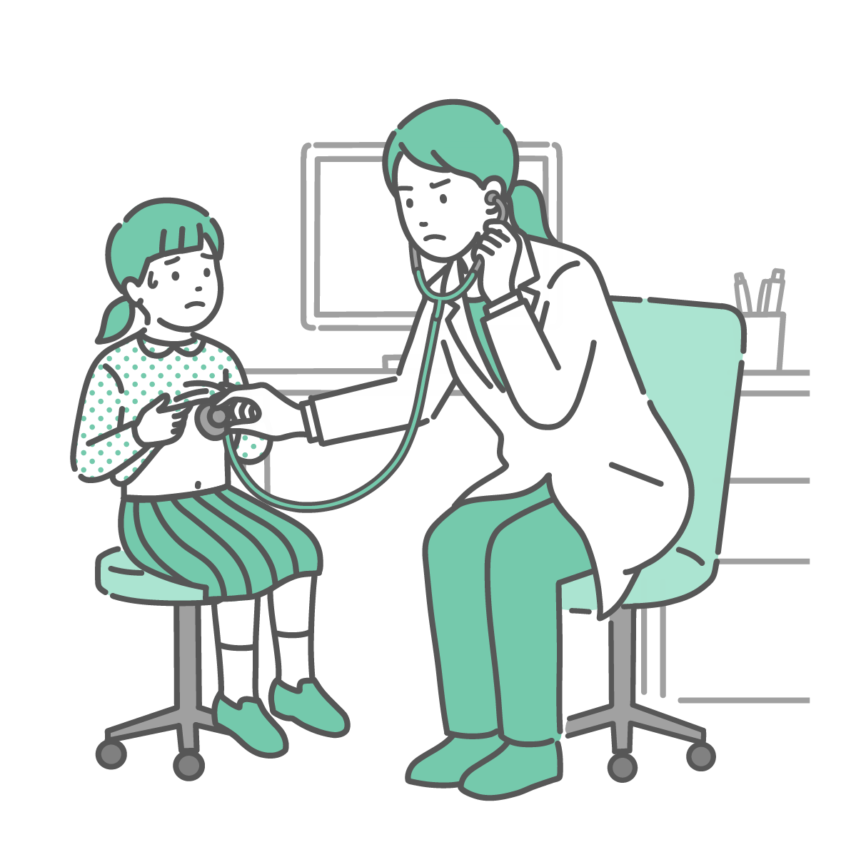 小児科・子供の健康 聴診を受ける冷や汗をかいた女の子と深刻な表情の白衣の女性医師のイラスト