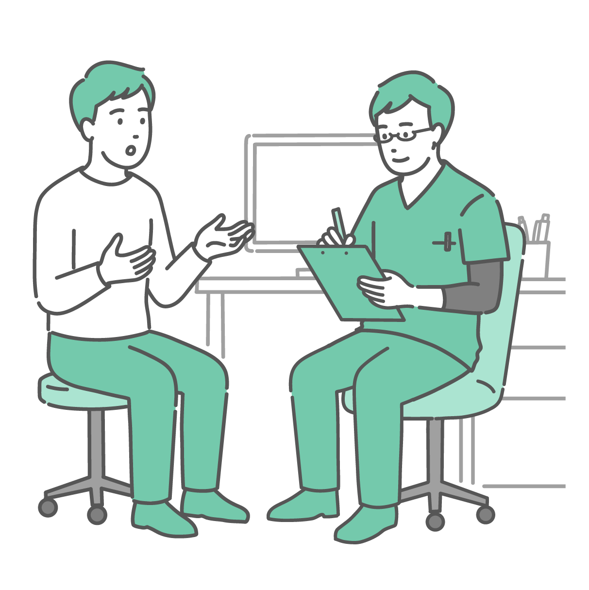 検査・測定 問診をする女性医師と男性患者(スクラブ・医療従事者)