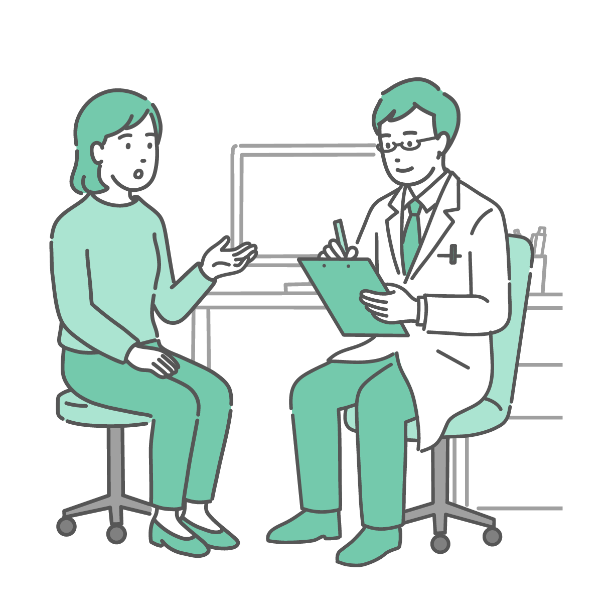 女性の健康・更年期 問診をする男性医師と女性患者(スクラブ・医療従事者)