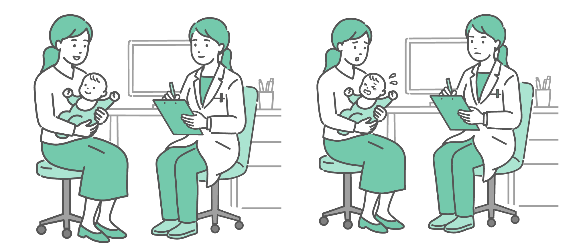 赤ちゃんの夜泣き・体調不良を相談する母親と女性医師(白衣・小児科)