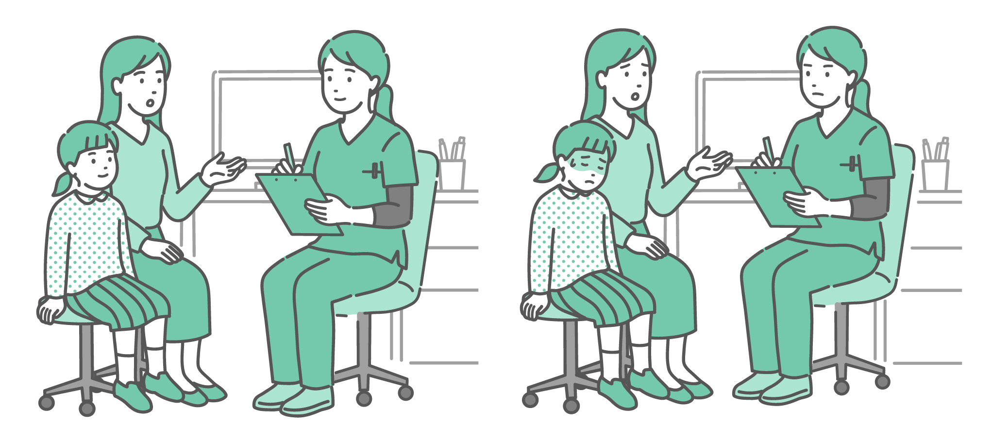 女性の健康・更年期 問診と体調不良の女性患者セット(女性医師・スクラブ)