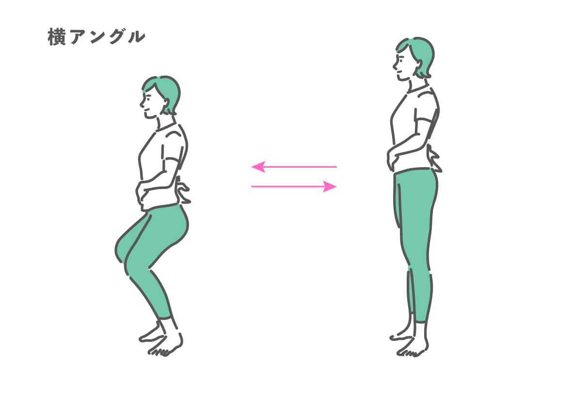 衛生・予防 腰割り体操の動作を側面から見たイラスト(立ち姿勢と腰を落とした姿勢)