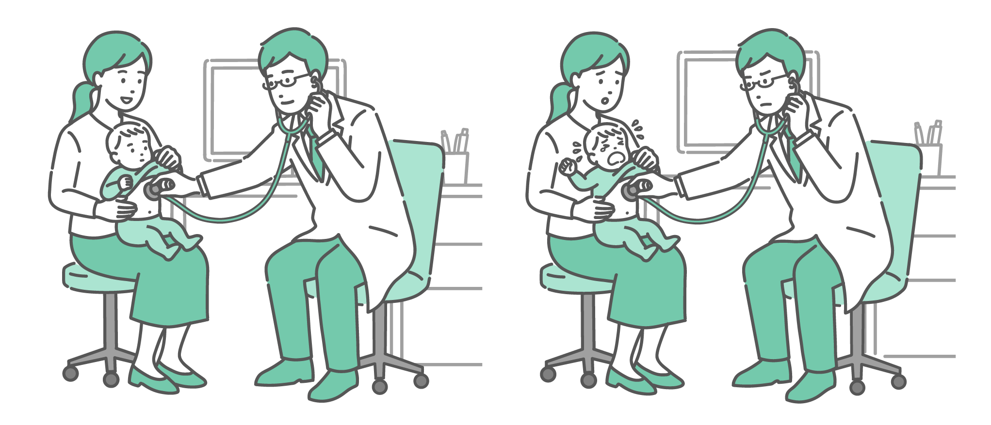 小児科・子供の健康 聴診器で赤ちゃんを診察する男性医師のイラストセット(白衣・小児科・通常と泣き顔)