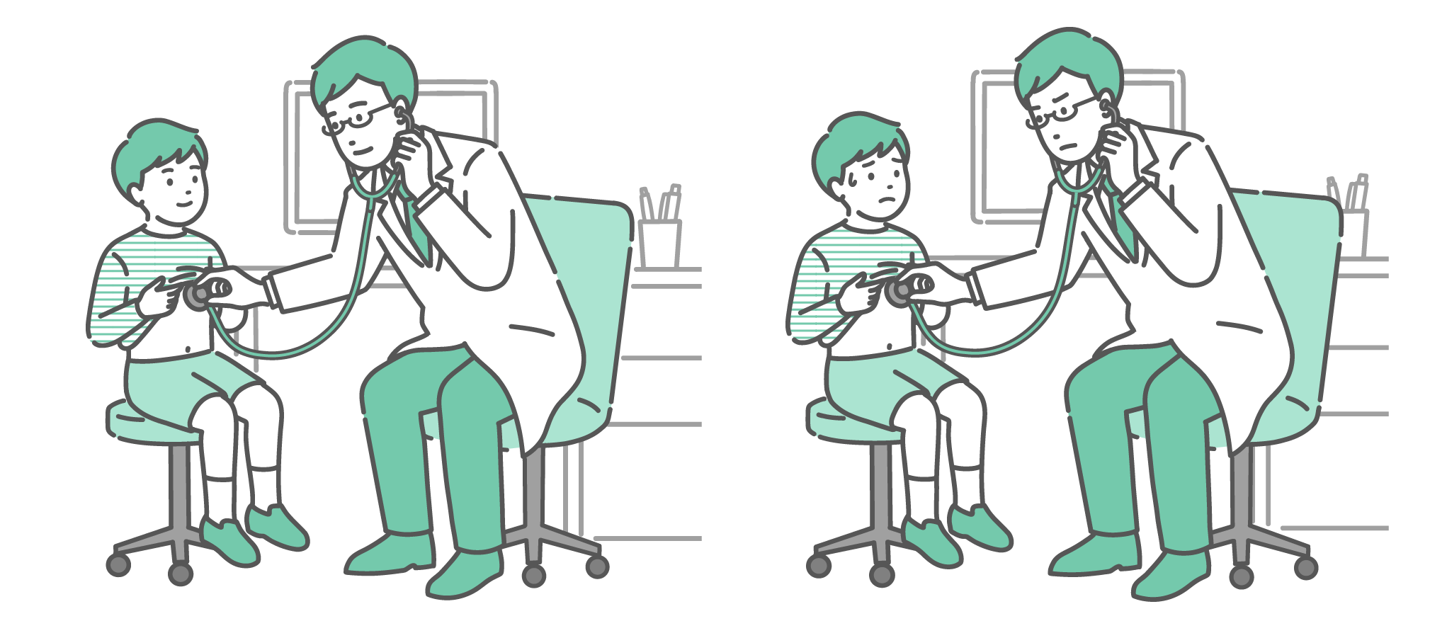 小児科・子供の健康 聴診器で診察する男性医師のイラストセット(白衣・男の子・通常と体調不良)
