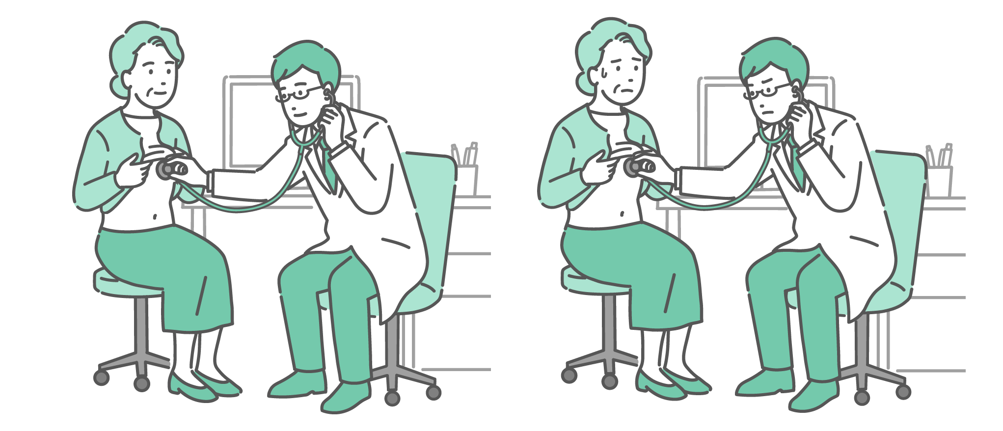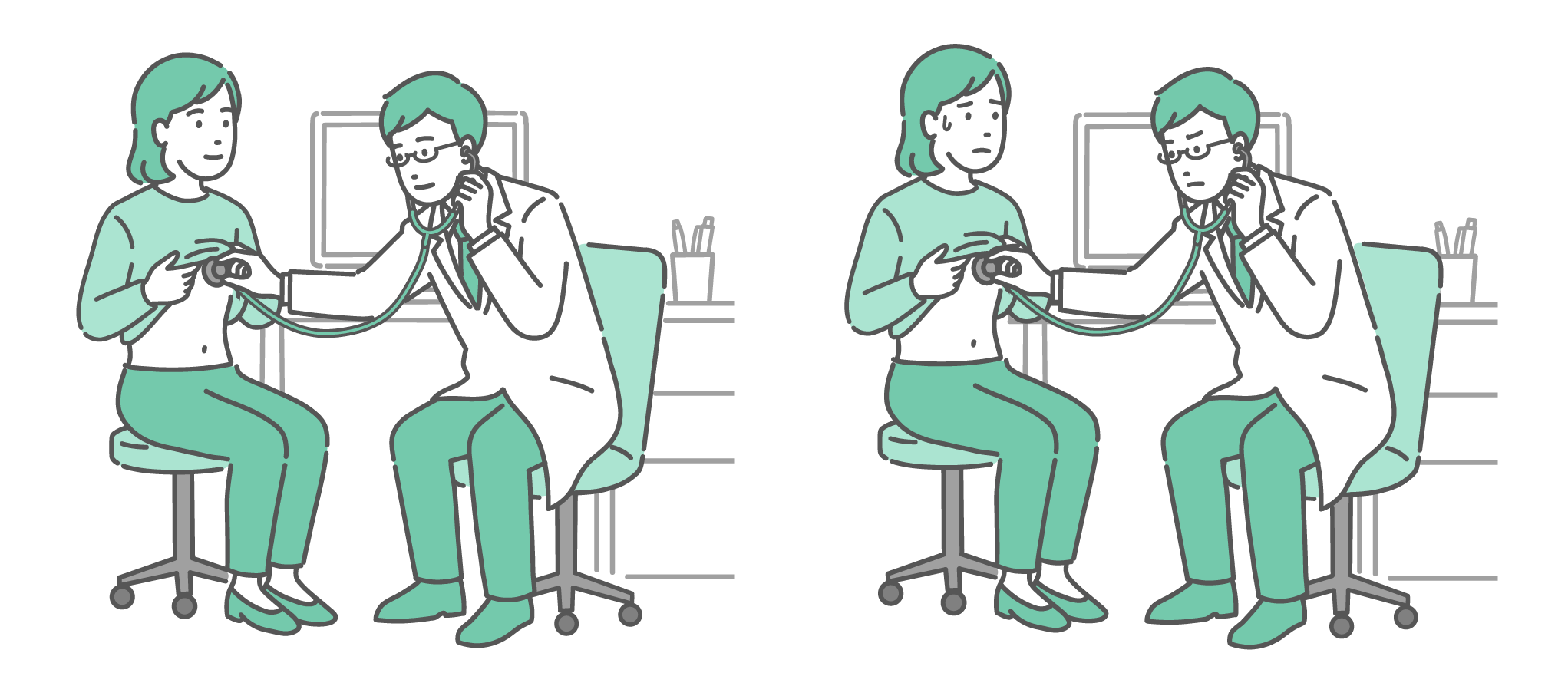 女性の健康・更年期 聴診器で診察する男性医師のイラストセット(白衣・女性患者・通常と体調不良)
