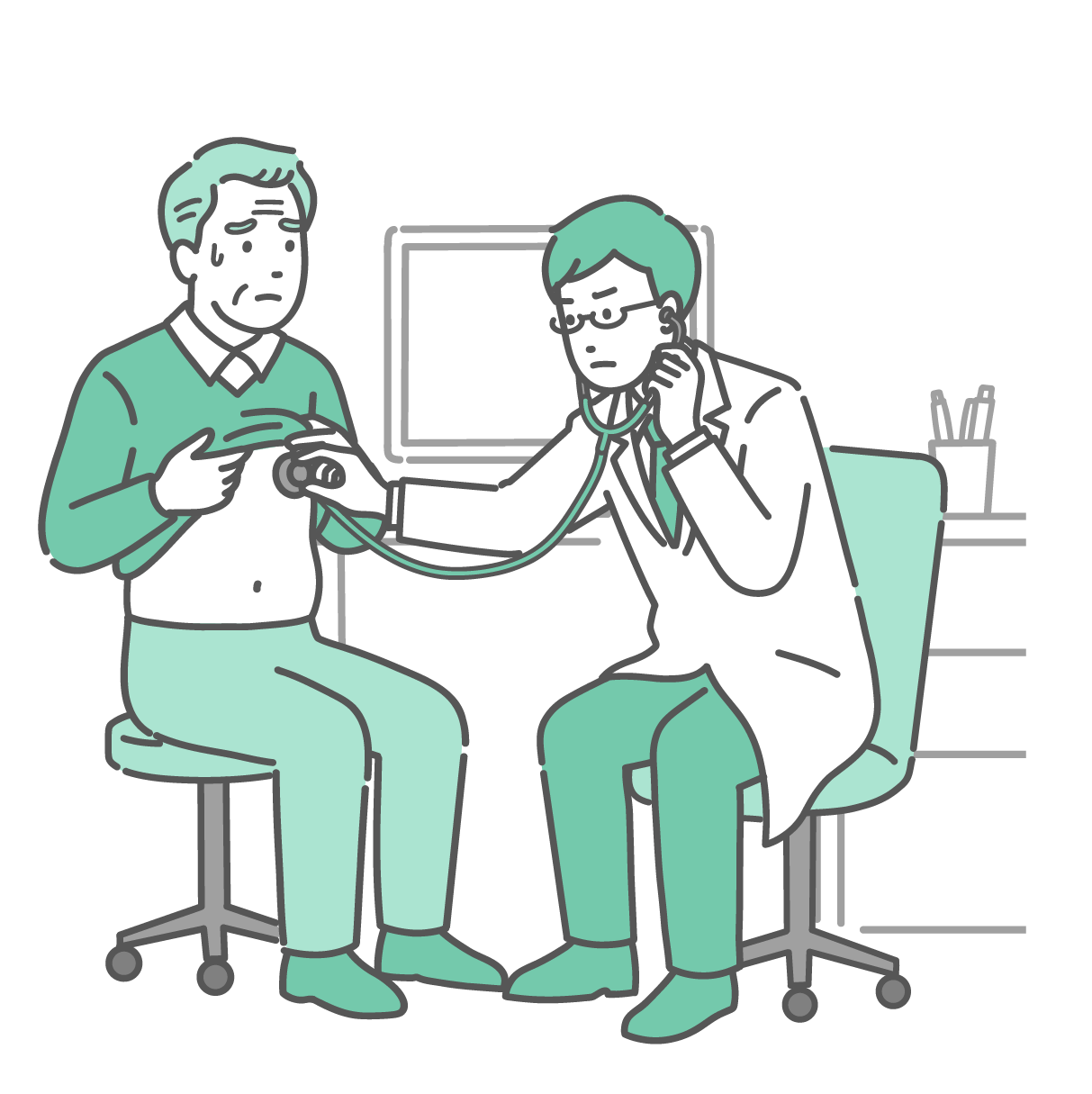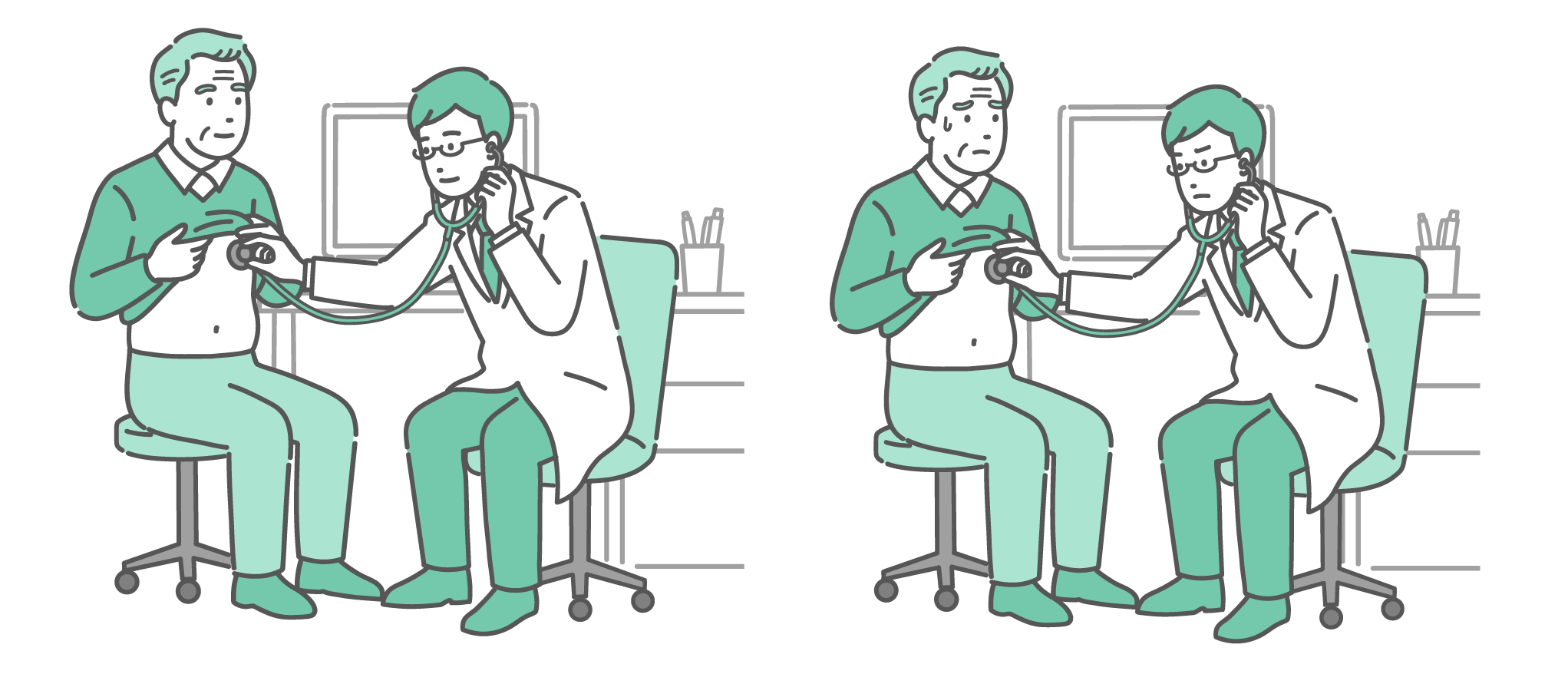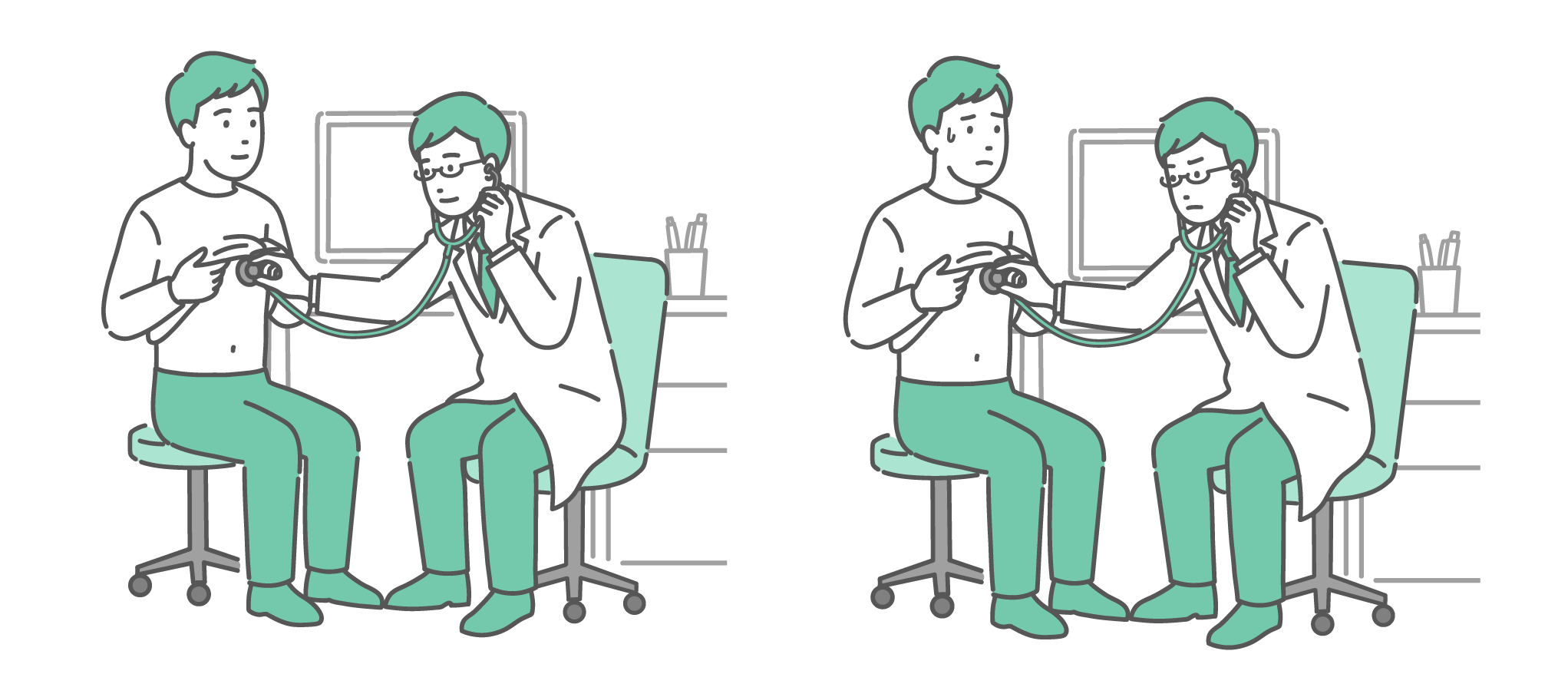 検査・測定 聴診器で診察する男性医師のイラストセット(白衣・男性患者・通常と体調不良)