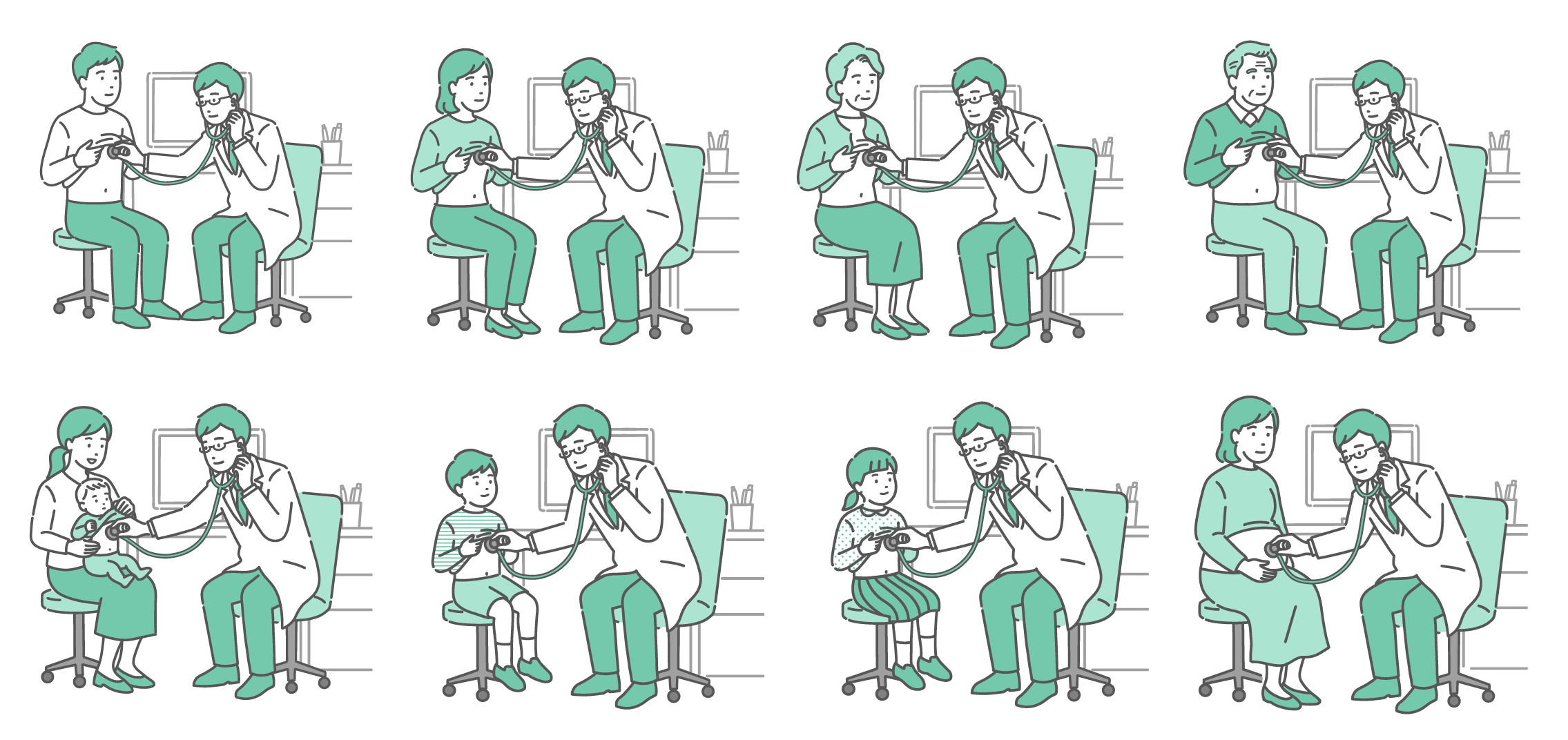 検査・測定 聴診器で診察する男性医師のイラストセット(白衣・全世代・患者バリエーション)