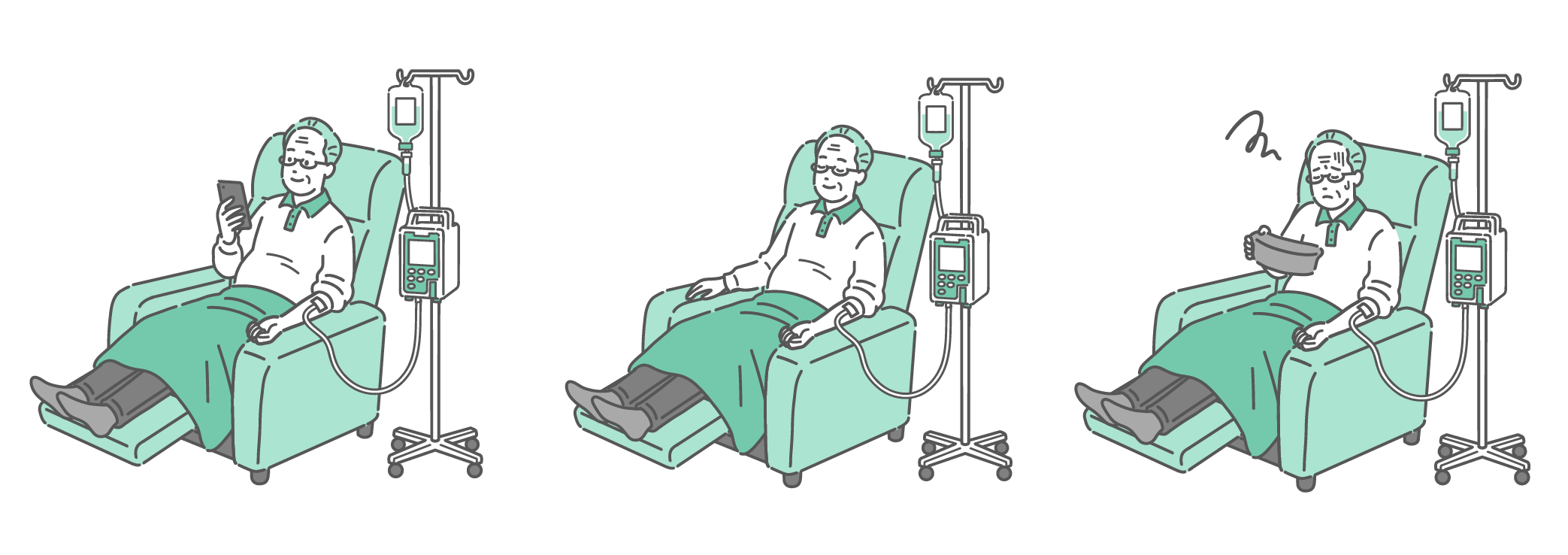 検査・測定 リクライニングで点滴を受ける高齢男性の3点セット(スマホ・睡眠・吐き気)