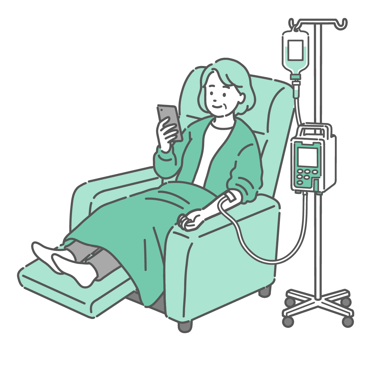 治療・処置 リクライニングチェアで点滴中にスマホを見る女性(外来化学療法・私服・輸液ポンプ)