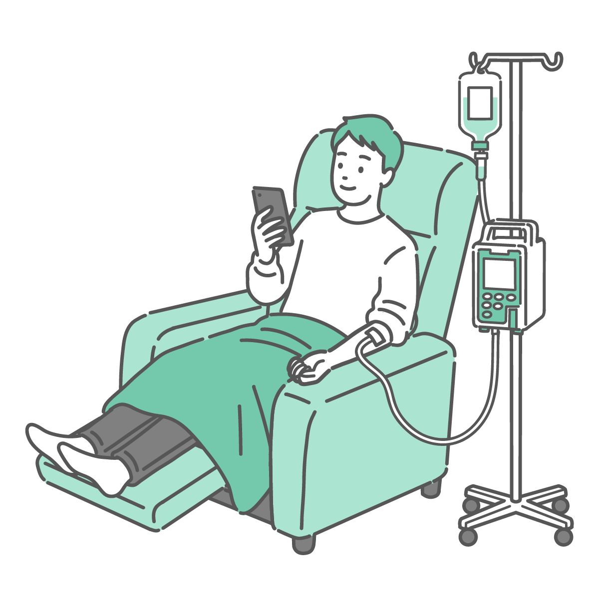 治療・処置 リクライニングチェアで点滴中にスマホを見る男性(外来化学療法・私服・輸液ポンプ)