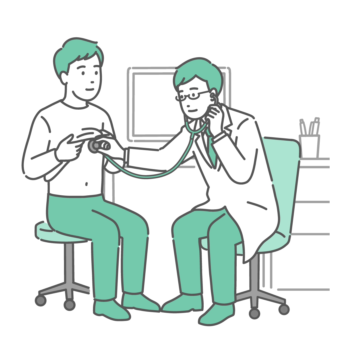 検査・測定 聴診器で胸の音を聞く男性医師(白衣・男性患者)
