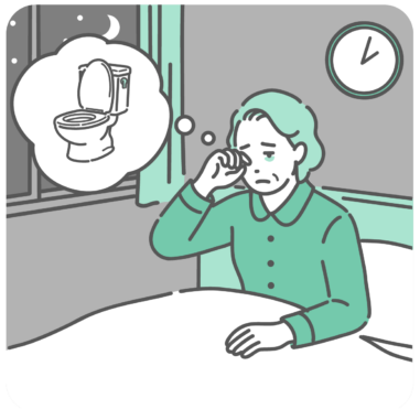 介護・福祉 夜間頻尿で夜中にトイレに起きる高齢女性のイラスト(頻尿・尿漏れ・睡眠障害)