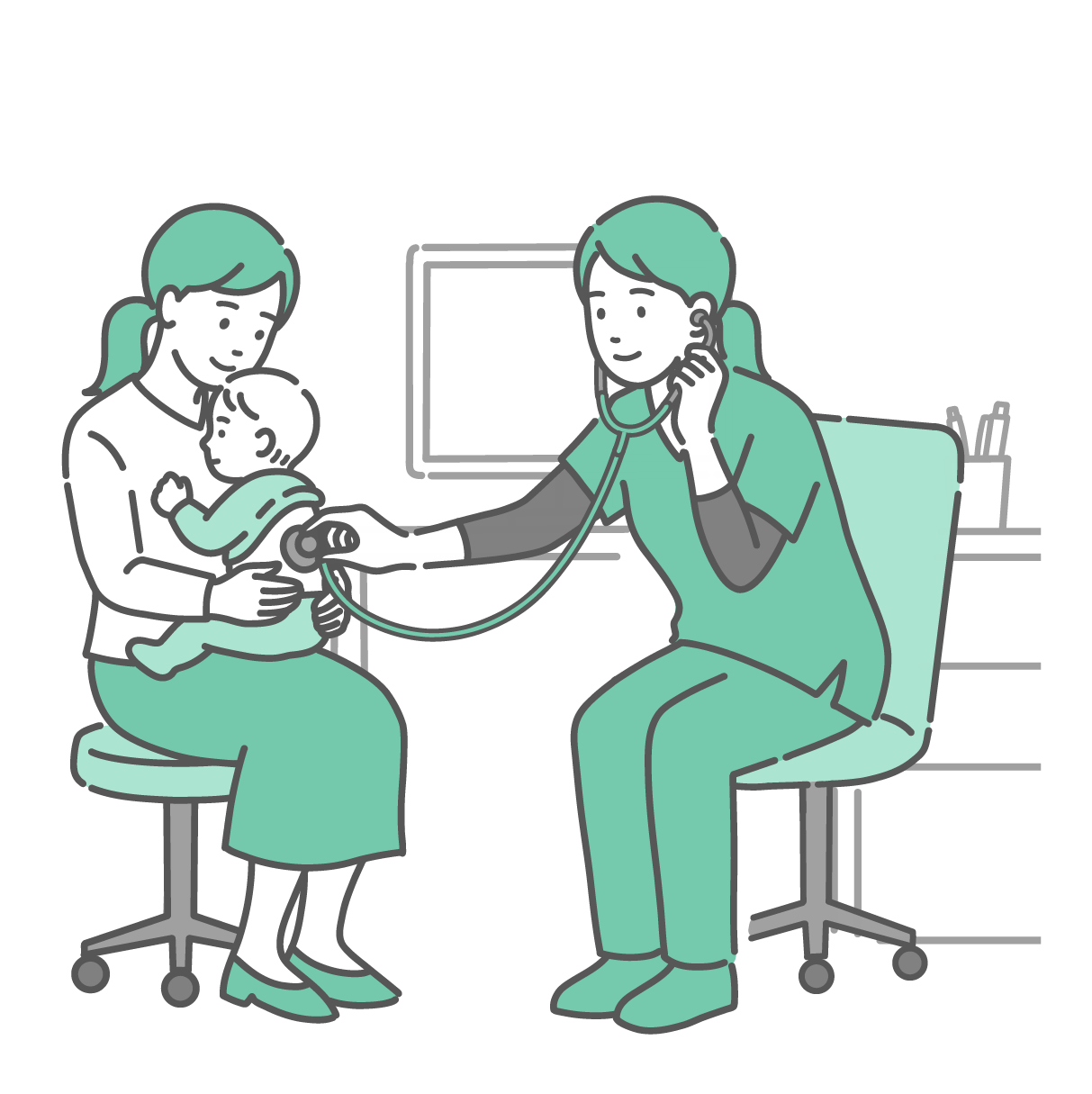 季節・アレルギー症状 スクラブを着用した女性医療従事者(医師・看護師)による母親に抱かれた赤ちゃんの背中の聴診イラスト