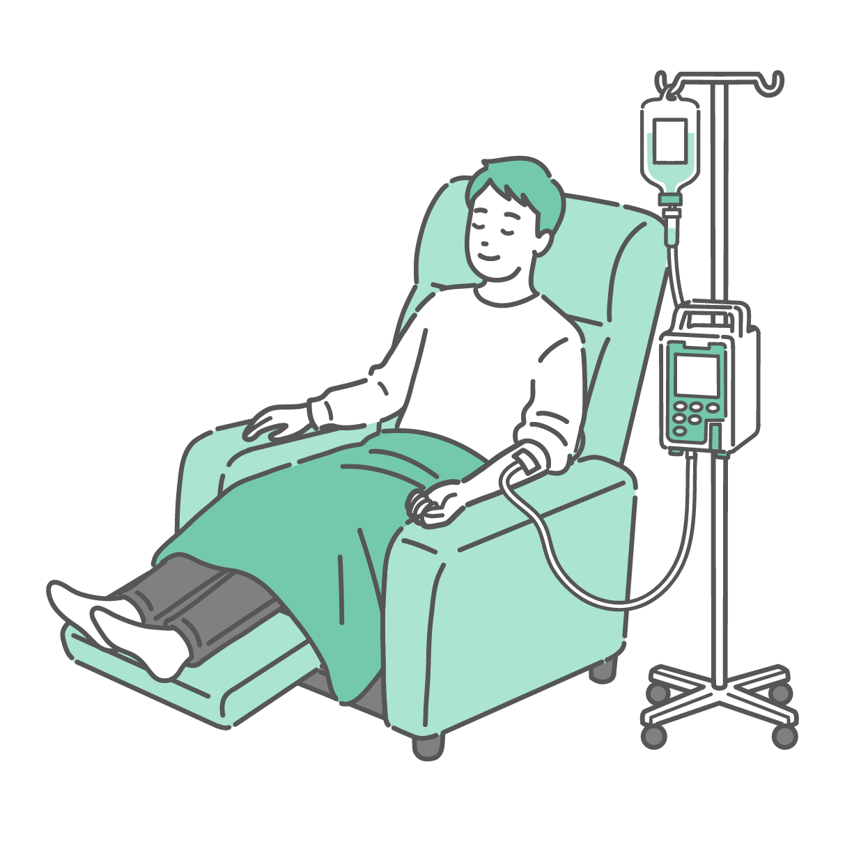 治療・処置 リクライニングチェアで点滴中に眠る男性(外来化学療法・休息)
