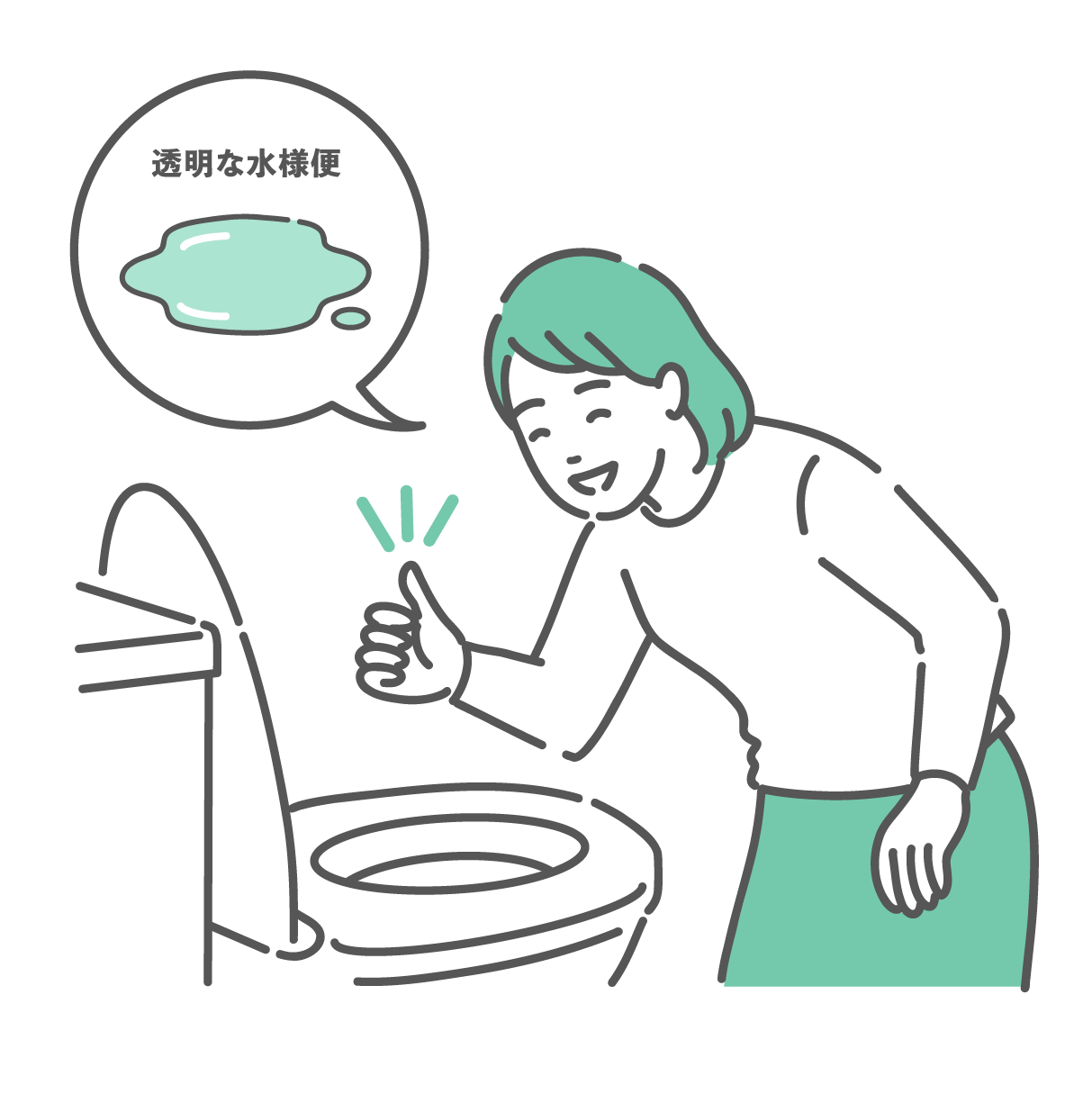 トイレで「透明な水様便」を確認してOKサインを出す女性のイラスト(大腸カメラ前処置・吹き出し)