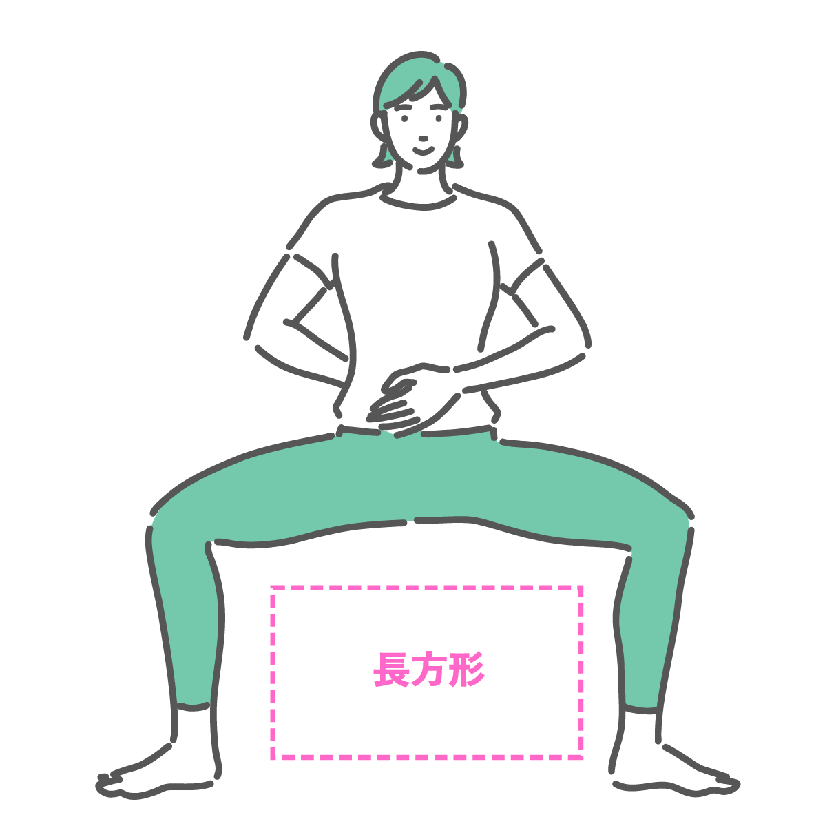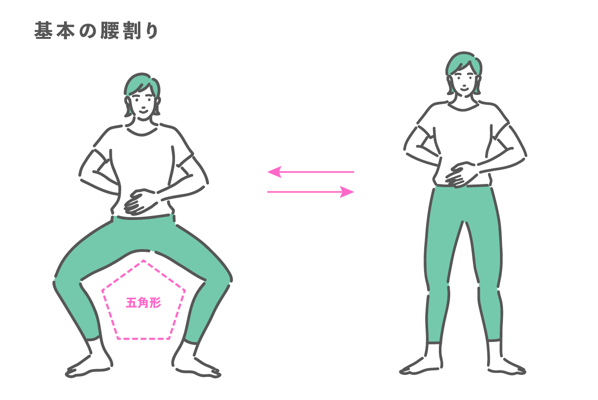 腰割り体操の基本フォームで腰を落としているイラスト(五角形フォーム)