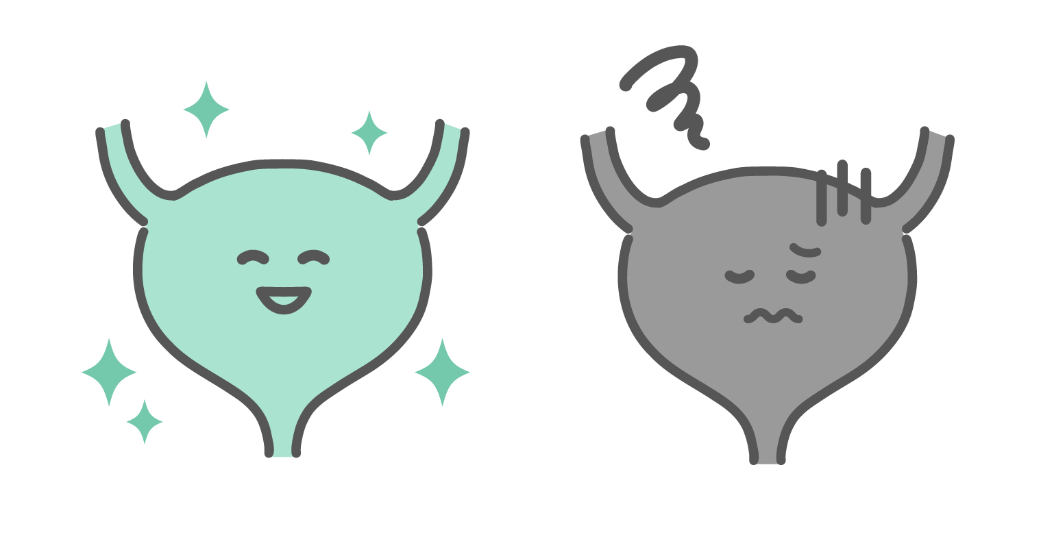 健康な膀胱と不調な膀胱の比較イラスト(キャラクター)