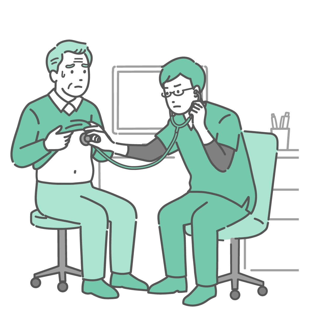 介護・福祉 聴診器で異常を確認する男性医師(白衣・体調不良の高齢男性患者)