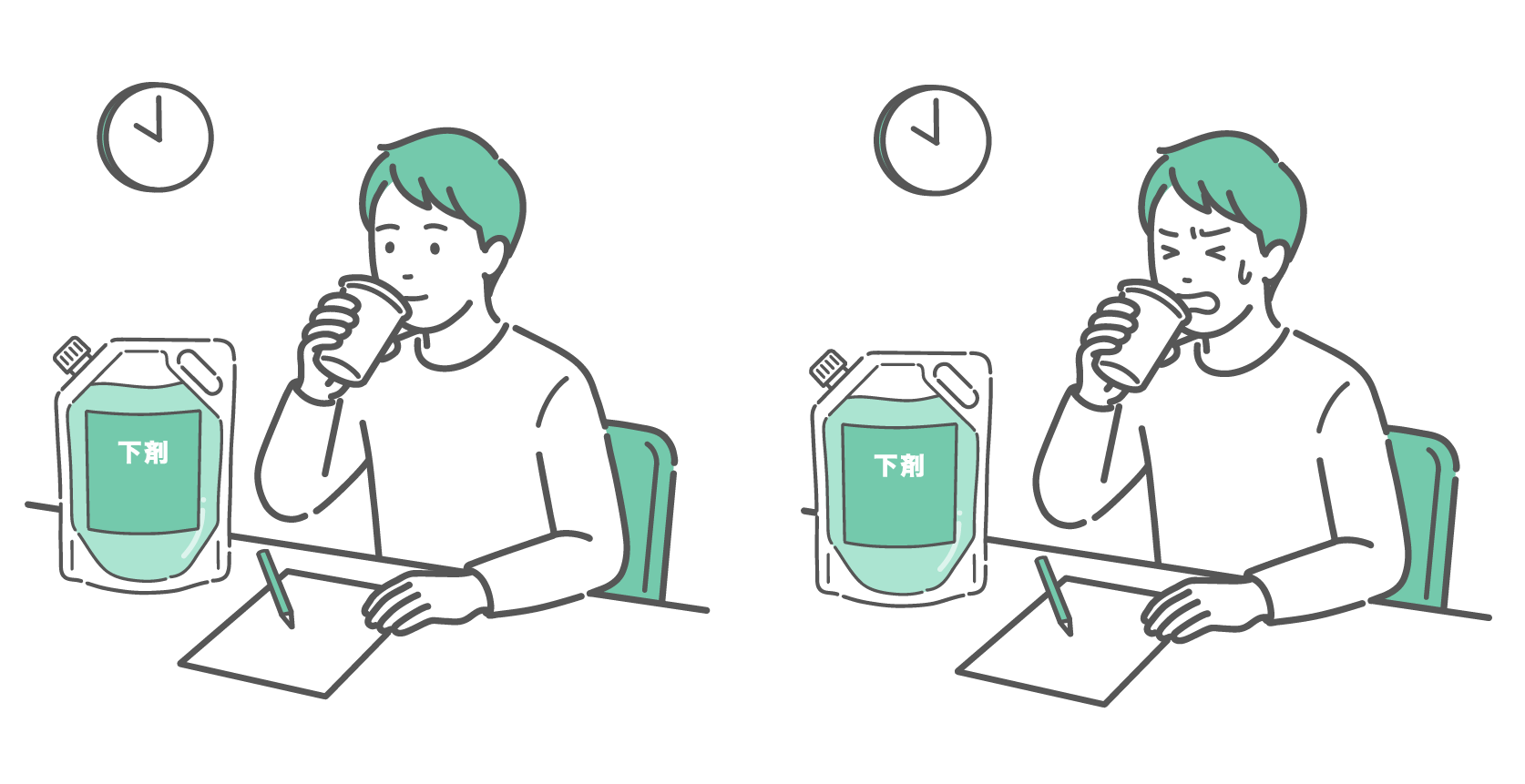 大腸カメラの下剤服用比較イラスト(余裕な男性と苦戦する男性)