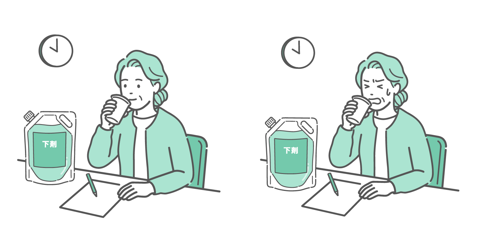大腸カメラの下剤服用比較イラスト(余裕な女性と苦戦する女性)