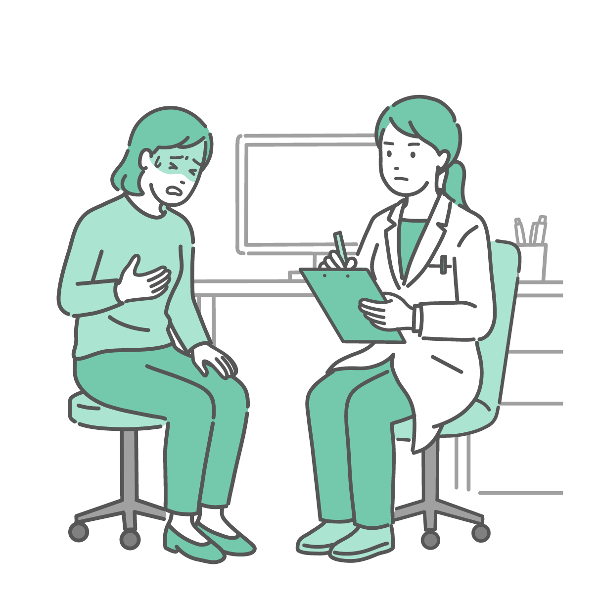 女性の健康・更年期 体調不良を訴える女性患者と女性医師(白衣・問診)