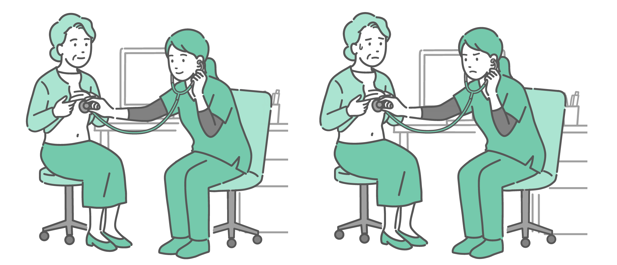 女性の健康・更年期 聴診を受ける冷や汗をかいた女性と深刻な表情のスクラブの女性医療従事者のイラスト