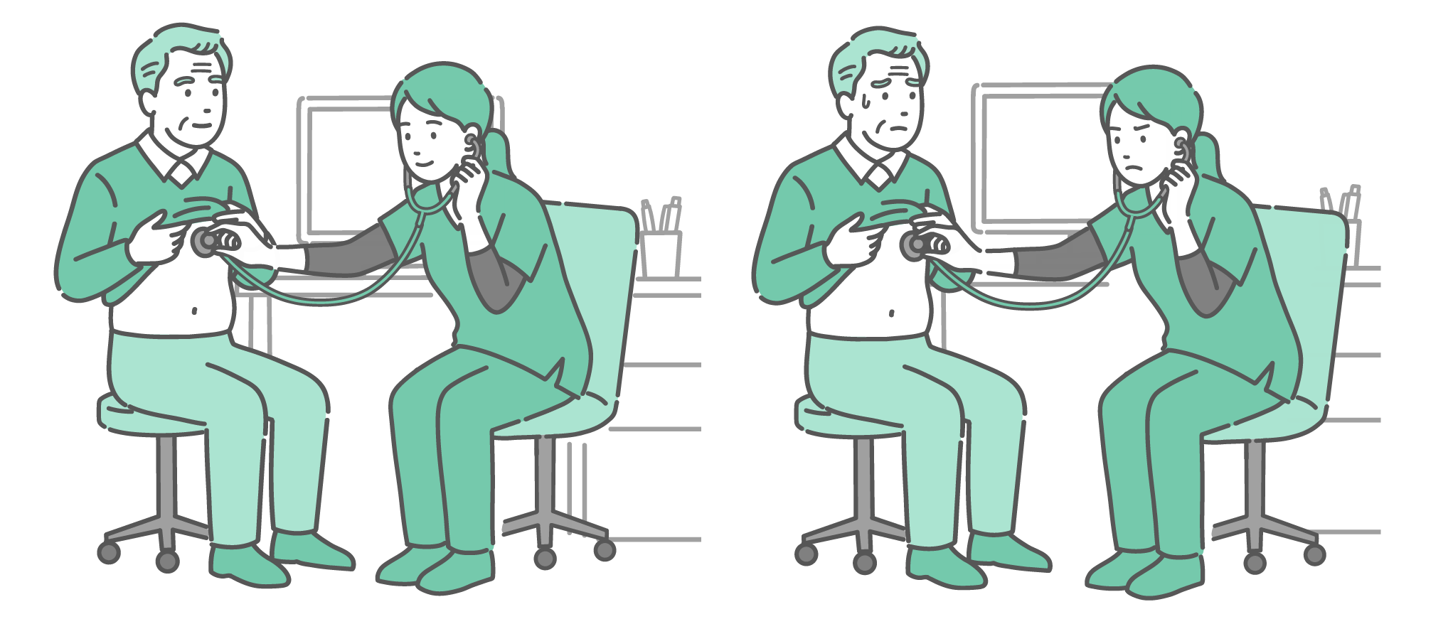 介護・福祉 聴診を受ける冷や汗をかいた高齢男性と深刻な表情のスクラブの女性医療従事者のイラスト