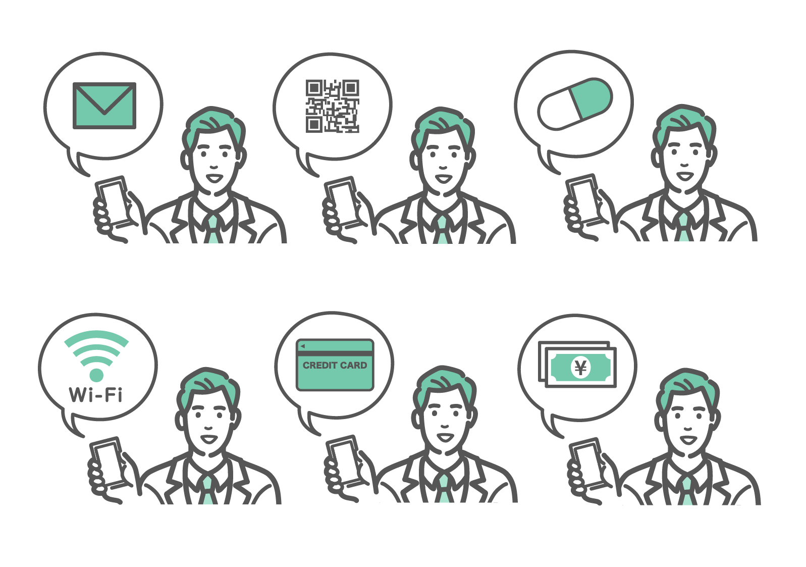 人物・アイテム メール、QRコード、決済、Wi-Fiなど6種のデジタルサービスを案内する白衣の男性のイラストセット