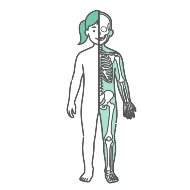 表面と骨格の対比がわかる女の子(子供)の人体図・全身モデルのイラスト(半身骨格・正面)