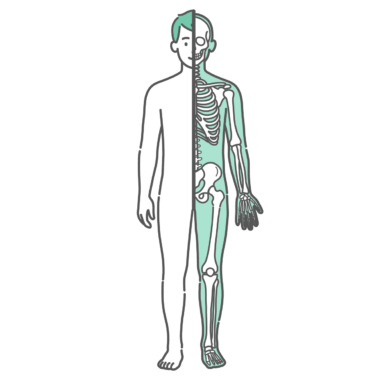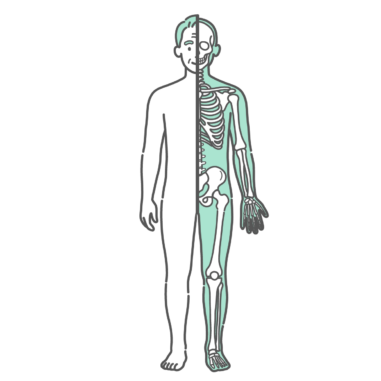 表面と骨格の対比がわかるシニア男性の人体図・全身モデルのイラスト(半身骨格・正面)