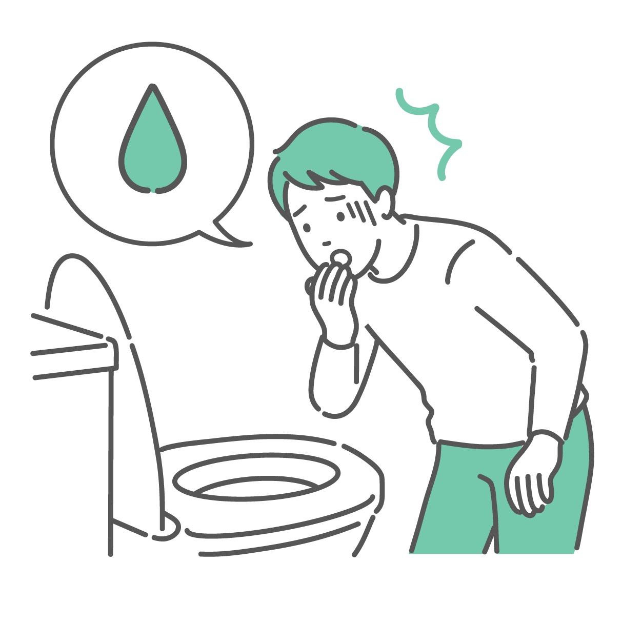 検査・測定 トイレで紙を見て出血や分泌物を確認する男性のイラスト(血便・尿漏れ・雫アイコン)