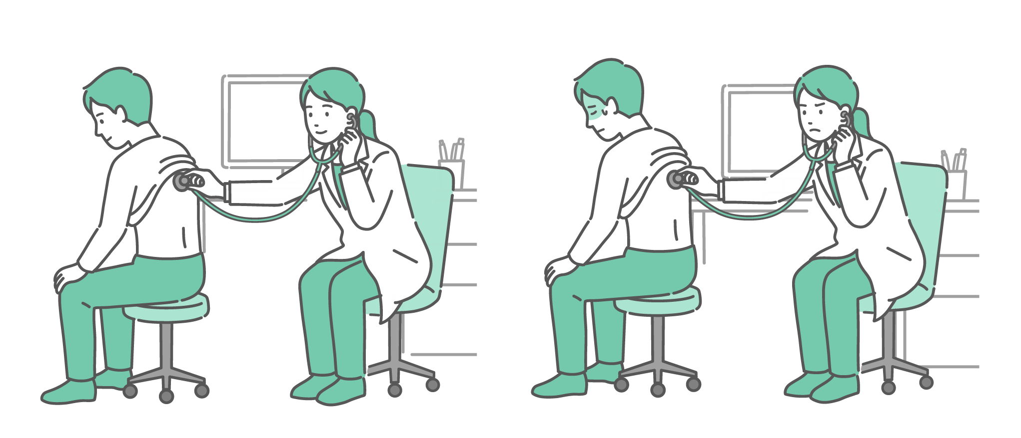 季節・アレルギー症状 白衣を着た女性医師による男性患者の背中の聴診イラストセット(正常・異常/体調不良)