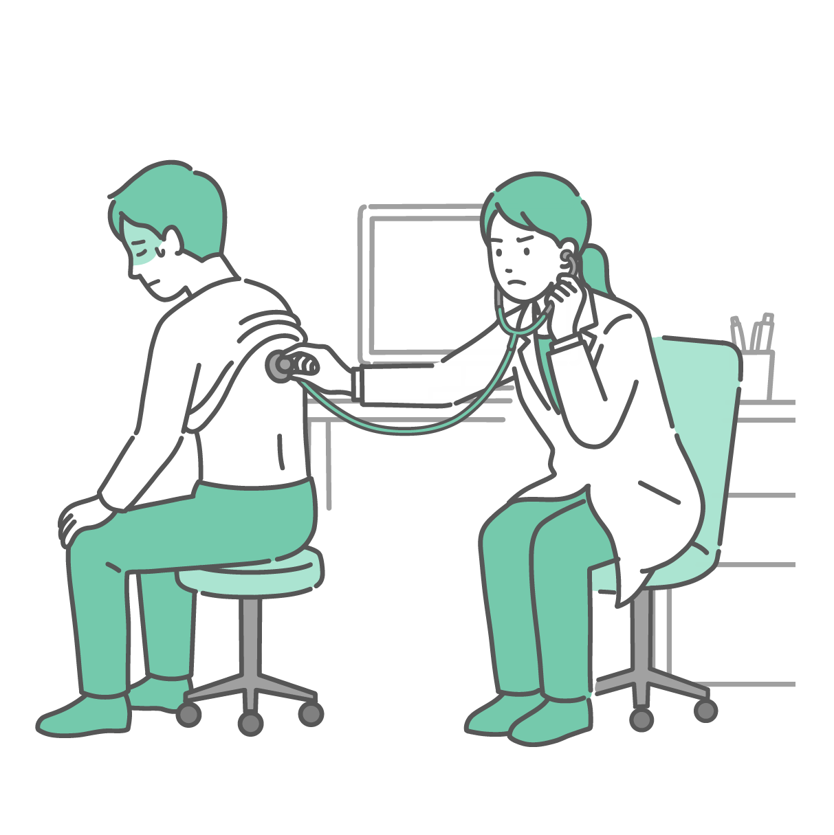季節・アレルギー症状 背中の聴診を受ける冷や汗をかいた男性と深刻な表情の白衣の女性医師のイラスト